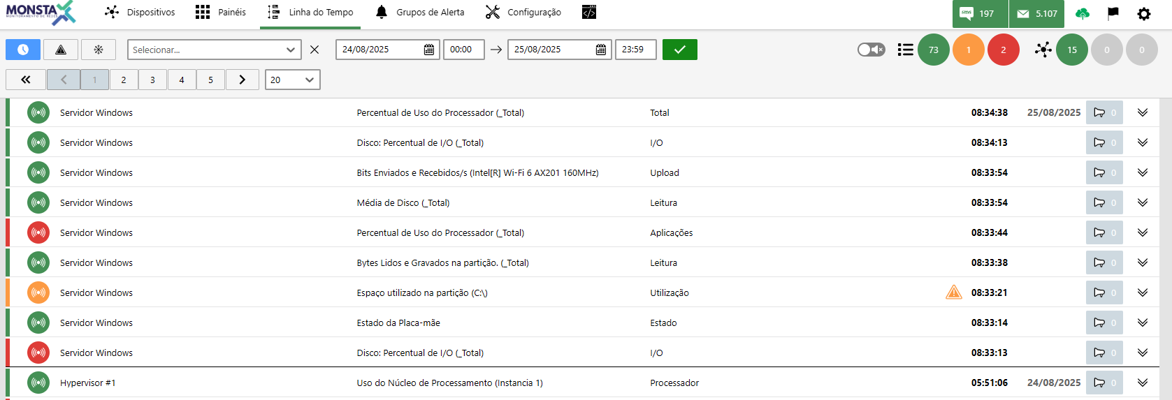A linha do tempo exibe todas as mudanças de status que ocorreram com os dispositivos e monitores no Monsta.
