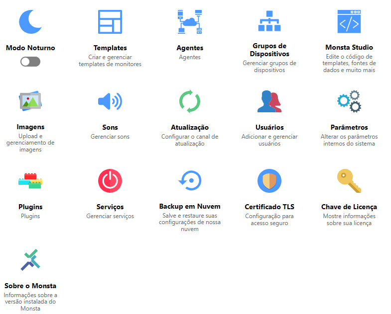 Permite alterar os parâmetros de configuração geral do Monsta. Parâmetros configurados de forma incorreta podem tornar o Monsta inoperante. |