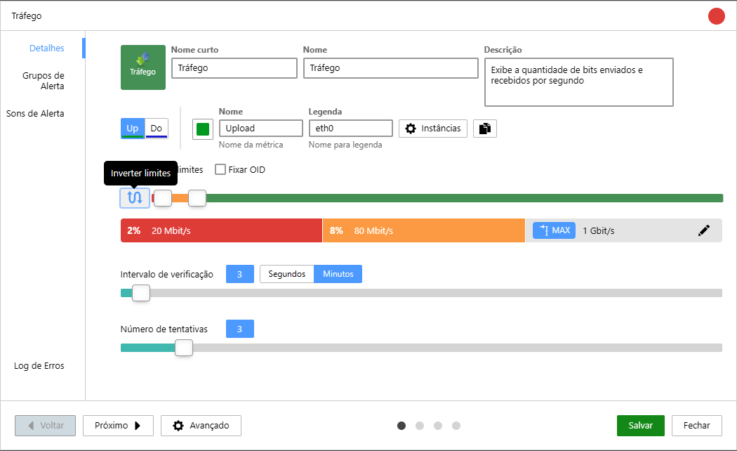 Os monitores de tráfego no Monsta, por padrão, assumem que quanto mais alto o valor, pior é o problema. Mas você pode inverter essa lógica para monitorar o seu link para trabalhar com: quanto mais baixo o valor, pior é o problema.